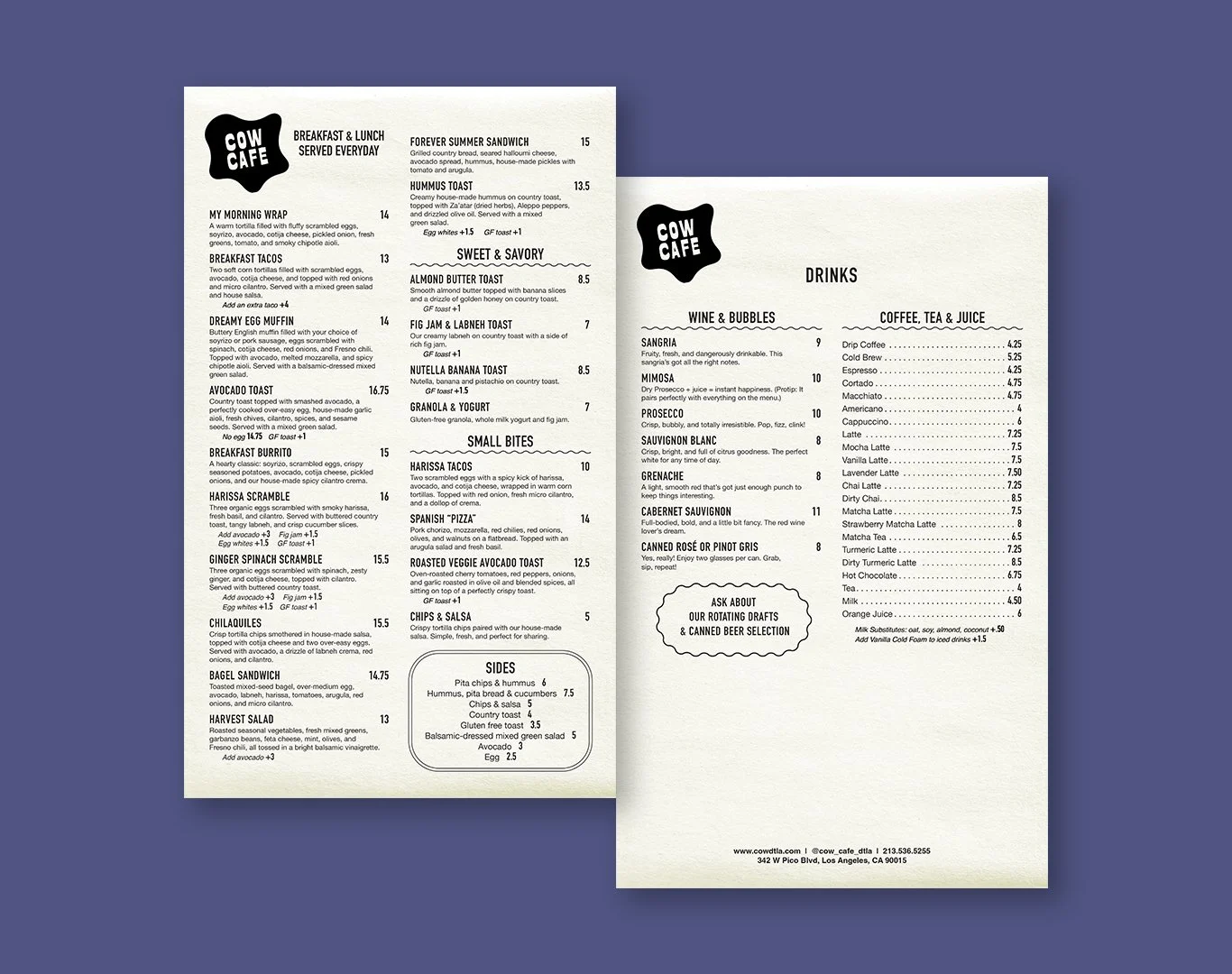 I led a logo and menu redesign for Cow Café, an established downtown Los Angeles business that’s been serving its neighborhood for over eight years. The goal was to refine the café’s existing character, creating a more cohesive visual identity that could live consistently across menus, social media, and in-store signage. The updated logo and menu system balance approachability with polish, helping Cow Café feel unified, contemporary, and better aligned with the quality and personality of the restaurant.